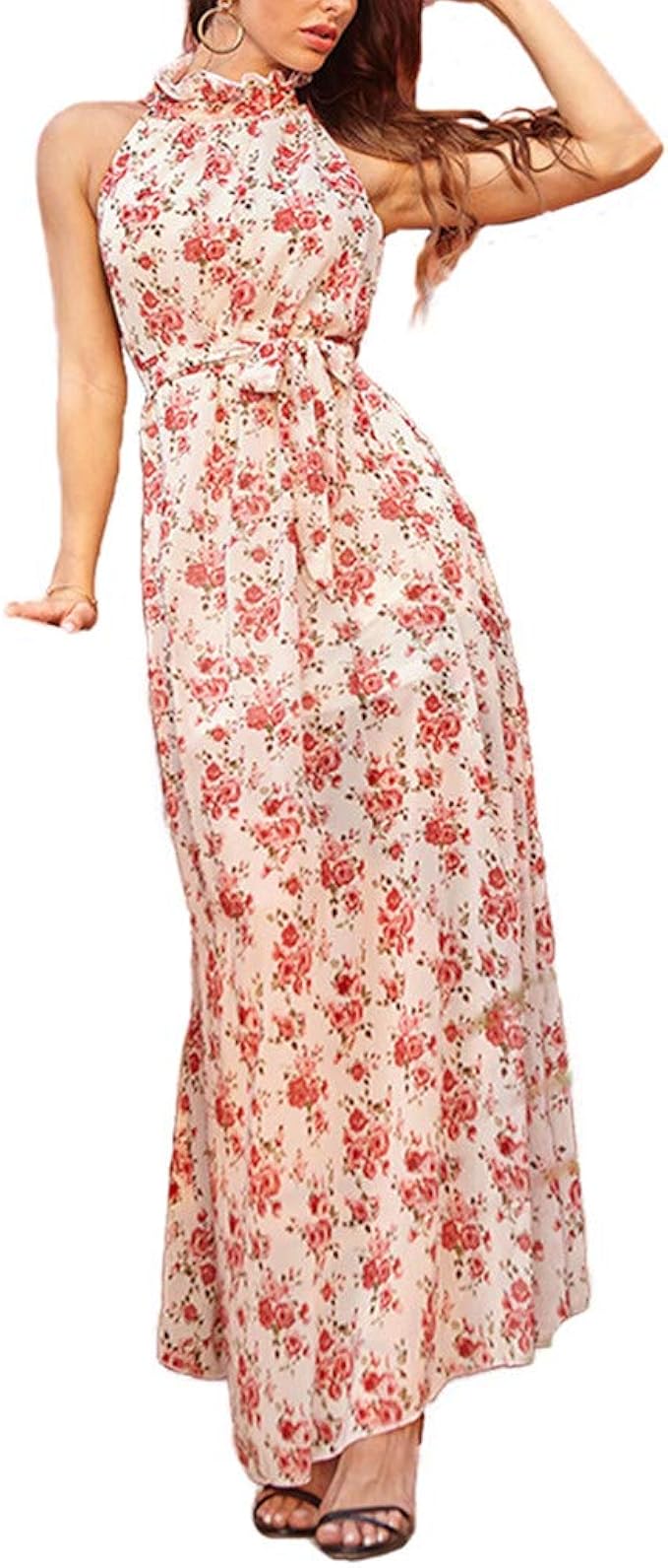 Damen Kleider Allskid Sommer Urlaub Neckholder Armellos Rose Blumendruck Hohe Taille Langes Kleid Eu 38 Cn L Weiss Rosa Amazon De Bekleidung
