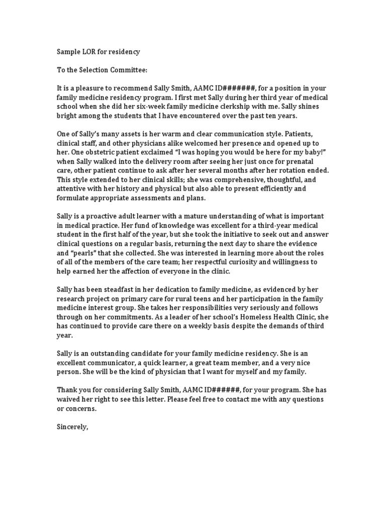 Residency Letter Of Recommendation Sample Medical Lor